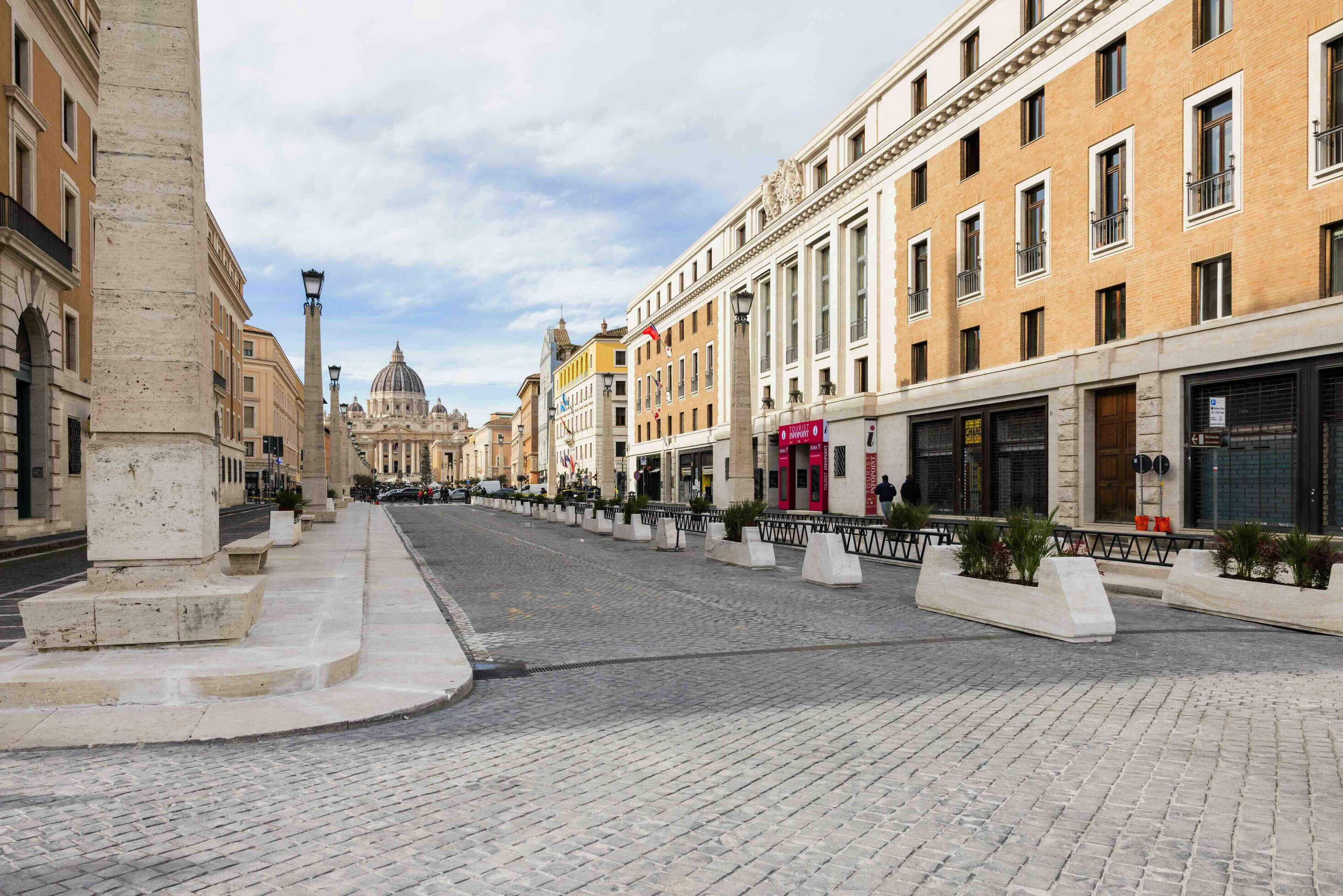 The aim of the intervention on Via della Conciliazione was to create a "protected" pedestrian path, with the aim of facilitating the flow of pilgrims and ensuring that it takes place in safety. This project, together with the construction of the Porta Pia subway, aimed to pedestrianise the area between Ponte Sant'Angelo - Castel Sant'Angelo and St Peter's Square. A multidisciplinary round table was set up to identify the most appropriate urban and architectural solutions, in order to protect the conservation aspects and enhance the historical heritage of the area concerned.