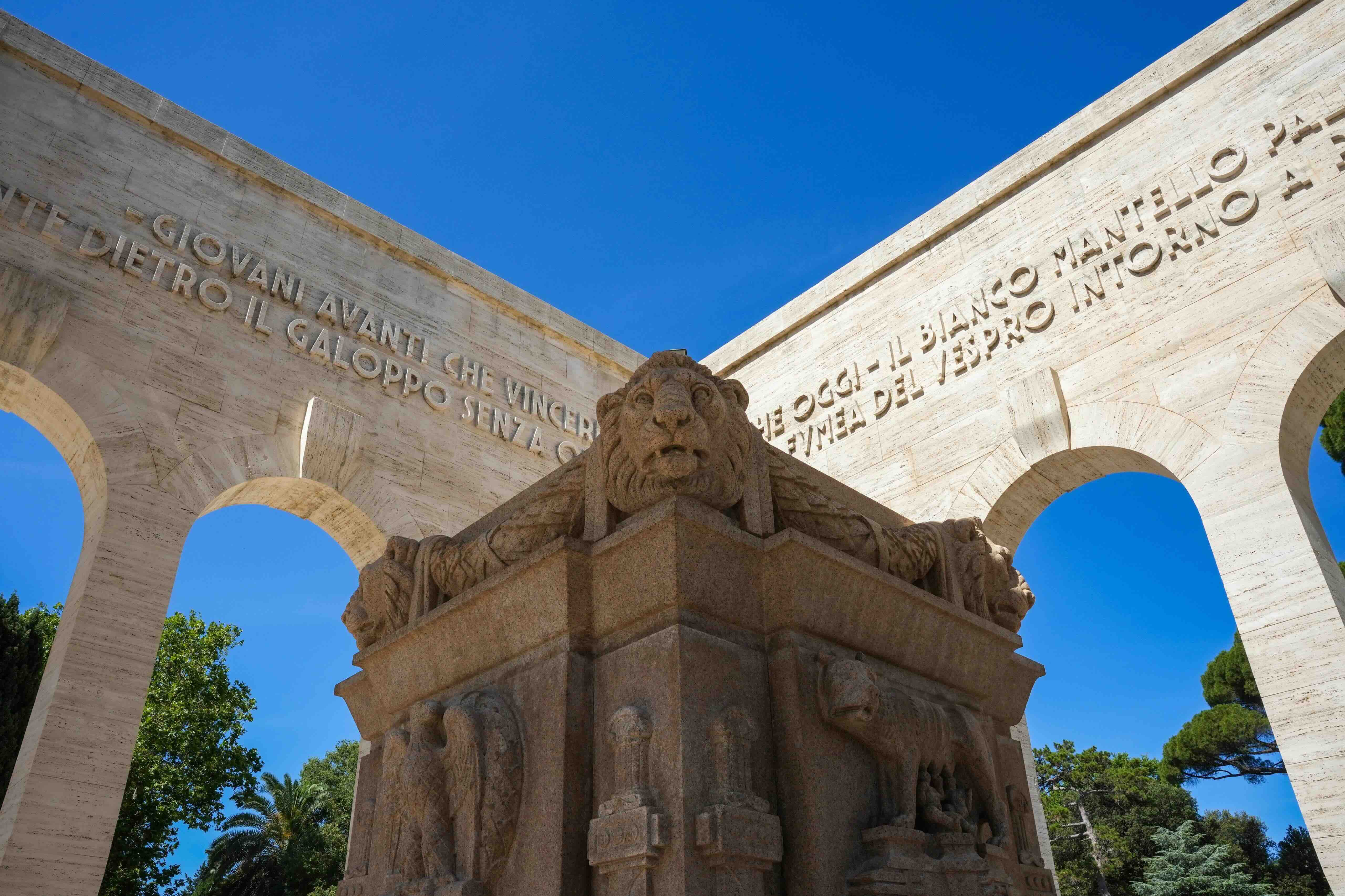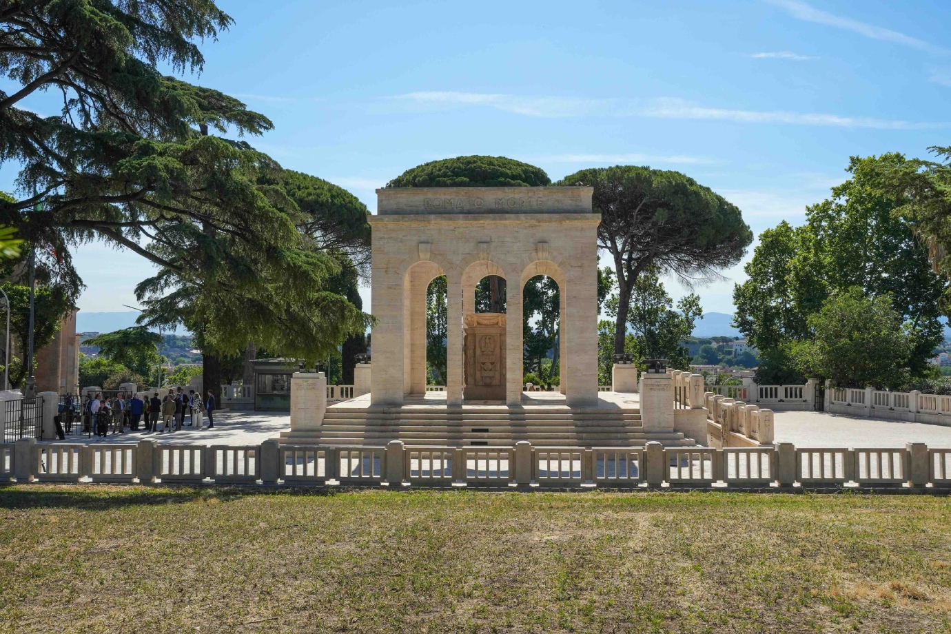 - la rimozione dei tratti di recinzione monumentale in travertino sul lato nord, seguita dal rimontaggio in asse a una quota superiore per consentire il distacco dalle radici degli alberi;
